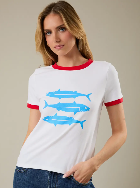 The Catch of the Day Ringer Tee features bold blue fish graphics on a crisp white base, finished with classic red ringer trim at the neckline and sleeves for that vintage-inspired touch. It’s the kind of tee that instantly feels like summer — easy, nostalgic, and effortlessly cool.